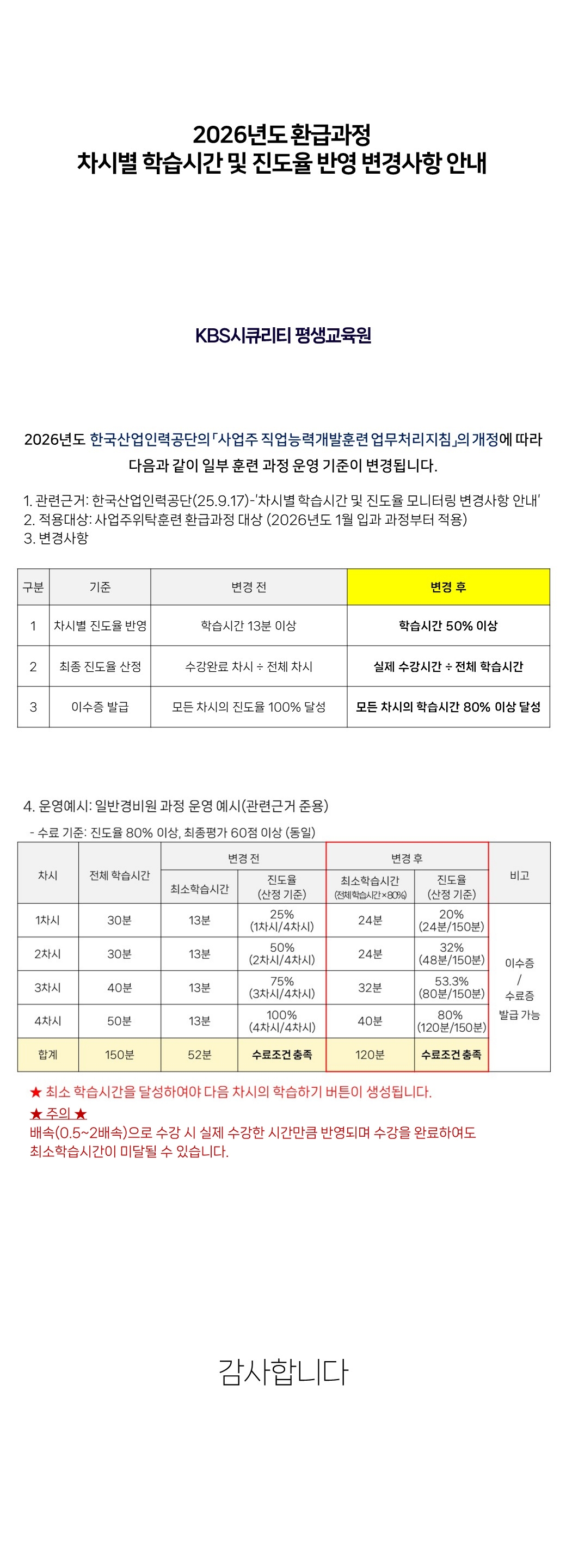 | [주요] [주요/필독] 26년도 환급과정 차시별 학습시간 및 진도율 반영 변경사항 안내 |